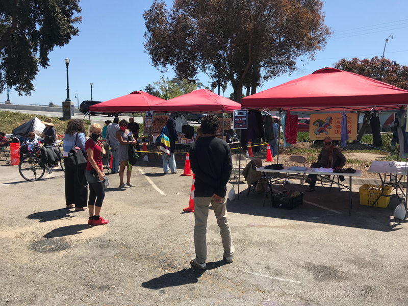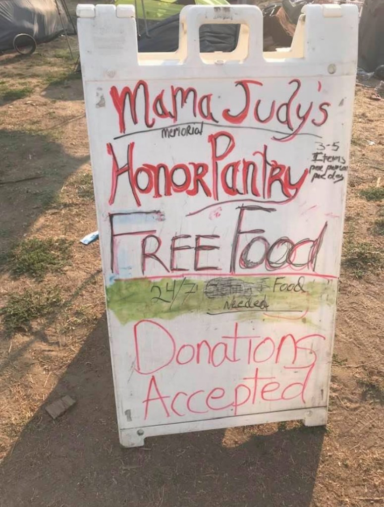 Our staff at the Santa Cruz Homeless Union tent unpacks the first half of the load. I take the other half to “Mama Judy’s Memorial Honor Pantry”. A grumpy camper tells me to screw off when I call out for help and returns to his dismantling of his tiny tent tossing parts into a pile unloved debris.