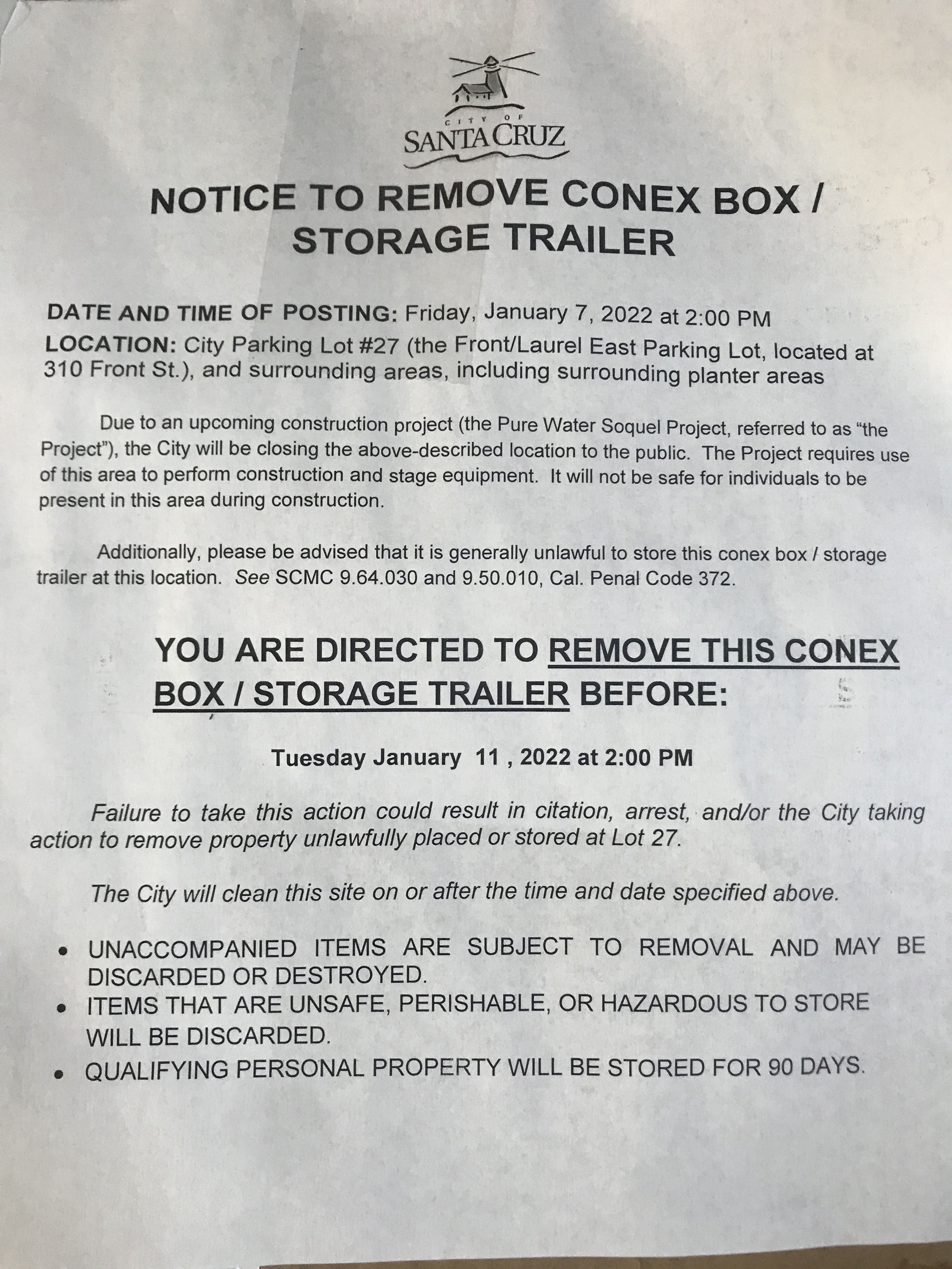 “I’m following up on our phone conversation a few minutes ago, in which I let you know that the City will require that Food Not Bombs (FNB) vacate Lot 27 by Tuesday, January 11, 2022 at 2:00 PM”