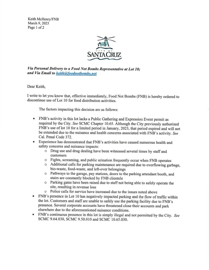 The city of Santa Cruz is not only failing to provide safe shelter during the atmospheric river on March 9, 2023 the city threatened to arrest Food Not Bombs if we shared our meal next to Parking Garage 10, forcing people to stand in the downpour to get the only daily hot meal provided to the homeless during three years of the pandemic lockdown. This sure is an odd way to honor the city’s one volunteer organization who shared food and survival gear every day since March 14, 2020.