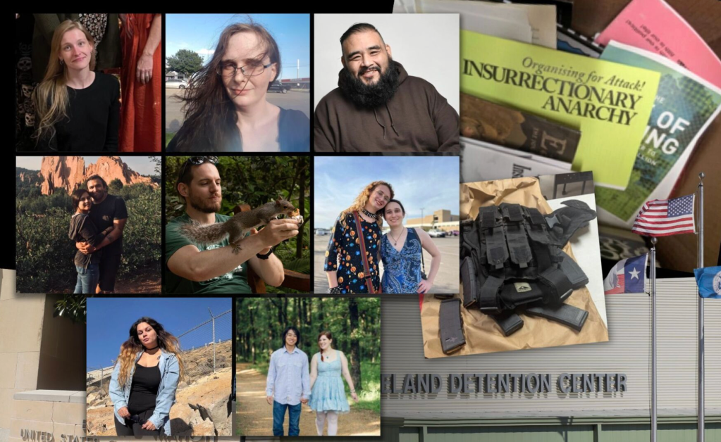 The Trump administration is demonizing this group of young anarchists who participated in the Independence Day protest outside the Prairieland Detention Center in Alvarado, Texas. Federal prosecutors claim at least six people in a Signal group chat named the “4th of July Party!” discussed what to bring to the Prairieland Detention Center in Alvarado: fireworks, guns, medical kits. At some point we are likely to learn that an infiltrator was on the chat encouraging bringing weapons to the protest.