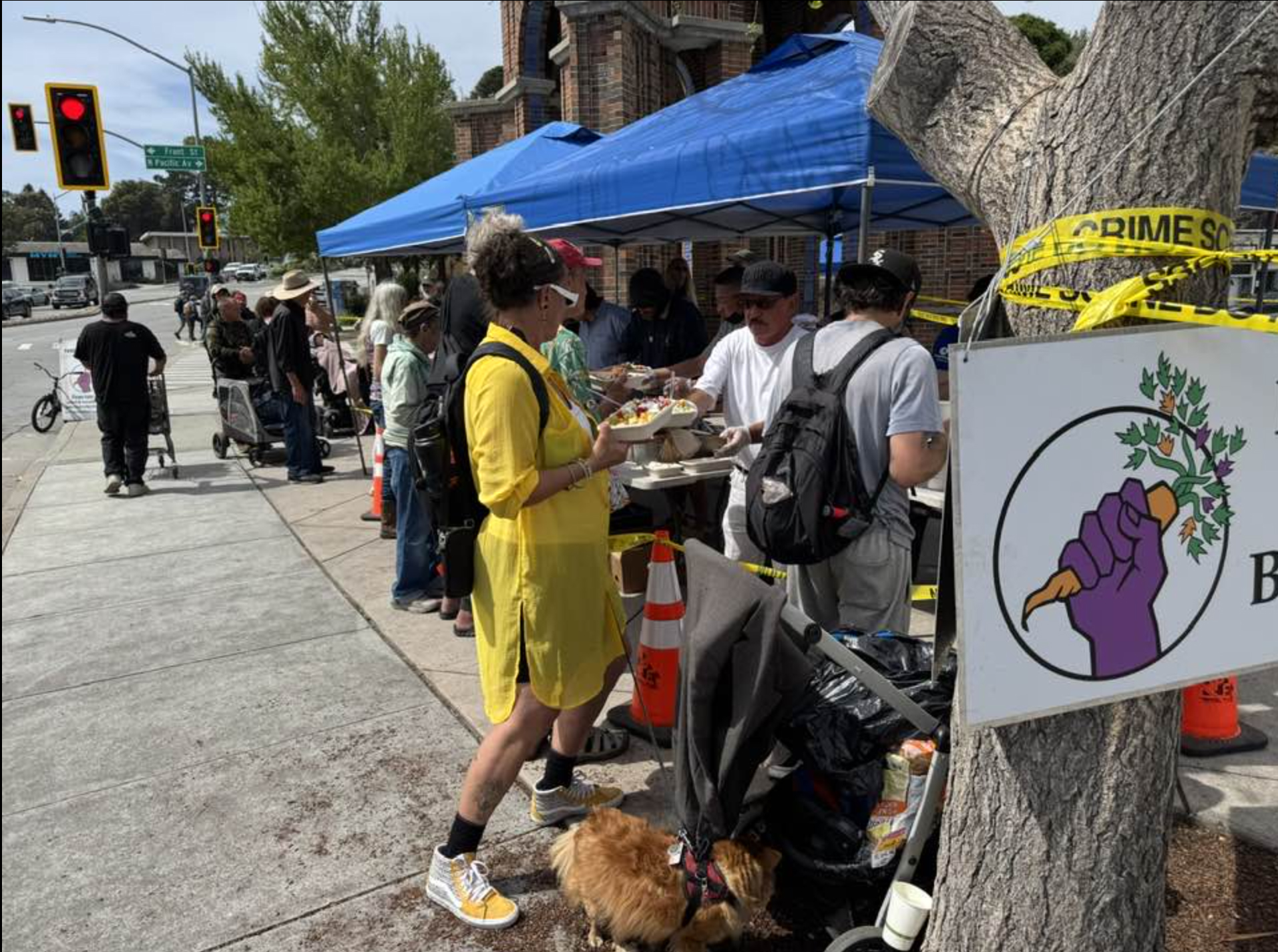 Ambulances finally arrive and rush the stabbing victims to the hospital. The police start unrolling yellow caution tape wrapping one end around the “Collateral Damage” monument, winding around our Knight Street facing canopy legs and over to the Food Not Bombs equipment trailer. The officer in charge suggests we reverse our serving area and share the meals on the Water Street side. “Tell your drivers they can pass the police line at River Street.” The police were so cooperative I emailed Chief Bernie Escalante asking him to thank his staff. The volunteers move the coffee urns, bread and paper products to the tables away from Water Street.