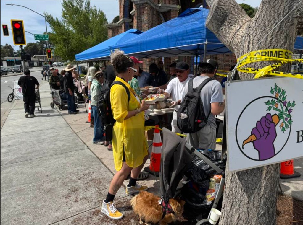 Several regulars stand at the Santa Cruz Food Not Bombs table waiting for their first warm cup of coffee. A line had yet to form. Lunch won’t be arriving for another thirty minutes.