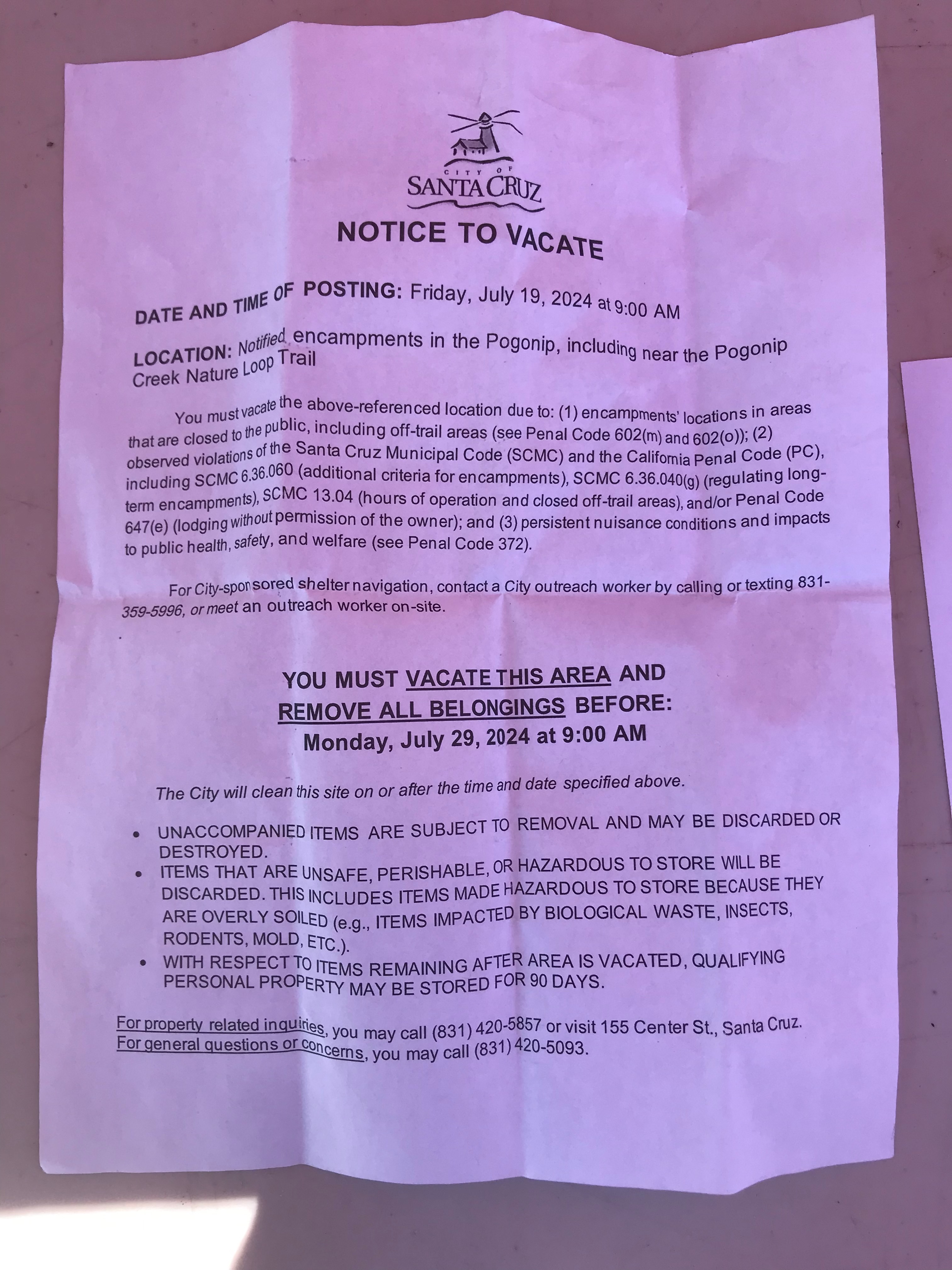 According to the Santa Cruz Sentinel two million dollars was provided to the City of Santa Cruz to clear the homeless camps that Food Not Bombs had been delivering food to at Harvey West Park and along Coral Street. To be fair there are claims that some of the two million would be used to build 55 tiny homes with a shared restroom. We will see.